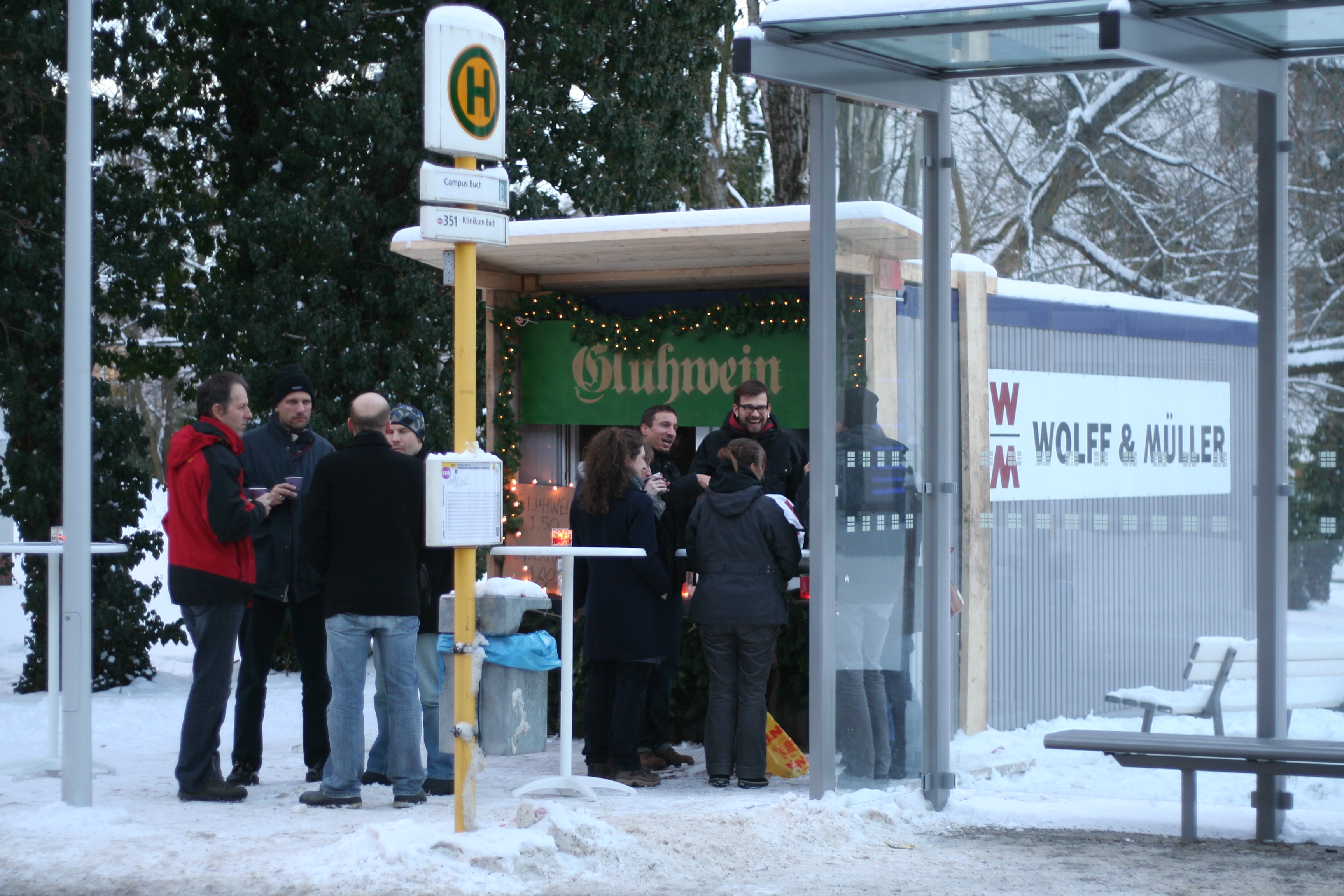 The Campus Buch Glühweinstand is back – now entering it’s 5th advent season, raising money for Mitte homeless shelter Klik Berlin. From early days as a rather haphazard and improvised experiment in a Bürocontainer in 2010, it’s now become a cornerstone of christmas tradition on the campus. All 30 volunteer shifts were booked out within 2 days – students, postdocs, TAs, group leaders, and science administrators from both MDC and FMP. The little hut was wheeled into place on its new Rasengittersteine by the Hausmeisters, decorated by the campus gardeners, and the race is now on between the volunteers to see who can turn in the biggest takings.
