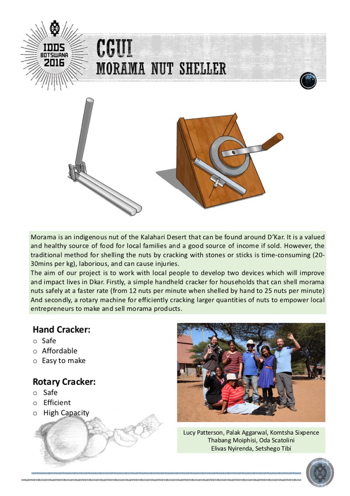 I was part of a team that worked to develop a locally produced nut sheller for cracking Morama (‘Cgui’ in the local Naro language), a very hard nut indigenous to the Kalahari traditionally valued by the local people for its high nutritional content. These nuts are usually roasted then cracked by hand using sticks or stones – a laborious and time-consuming process that often results in injuries. We developed prototypes for both a simple handheld nutcracker for household use and a high-capacity sheller that could be used for producing value-added Morama products – for example a hot drink, ‘Cgui Tsam’ – providing a source of income for local entrepreneurs.
